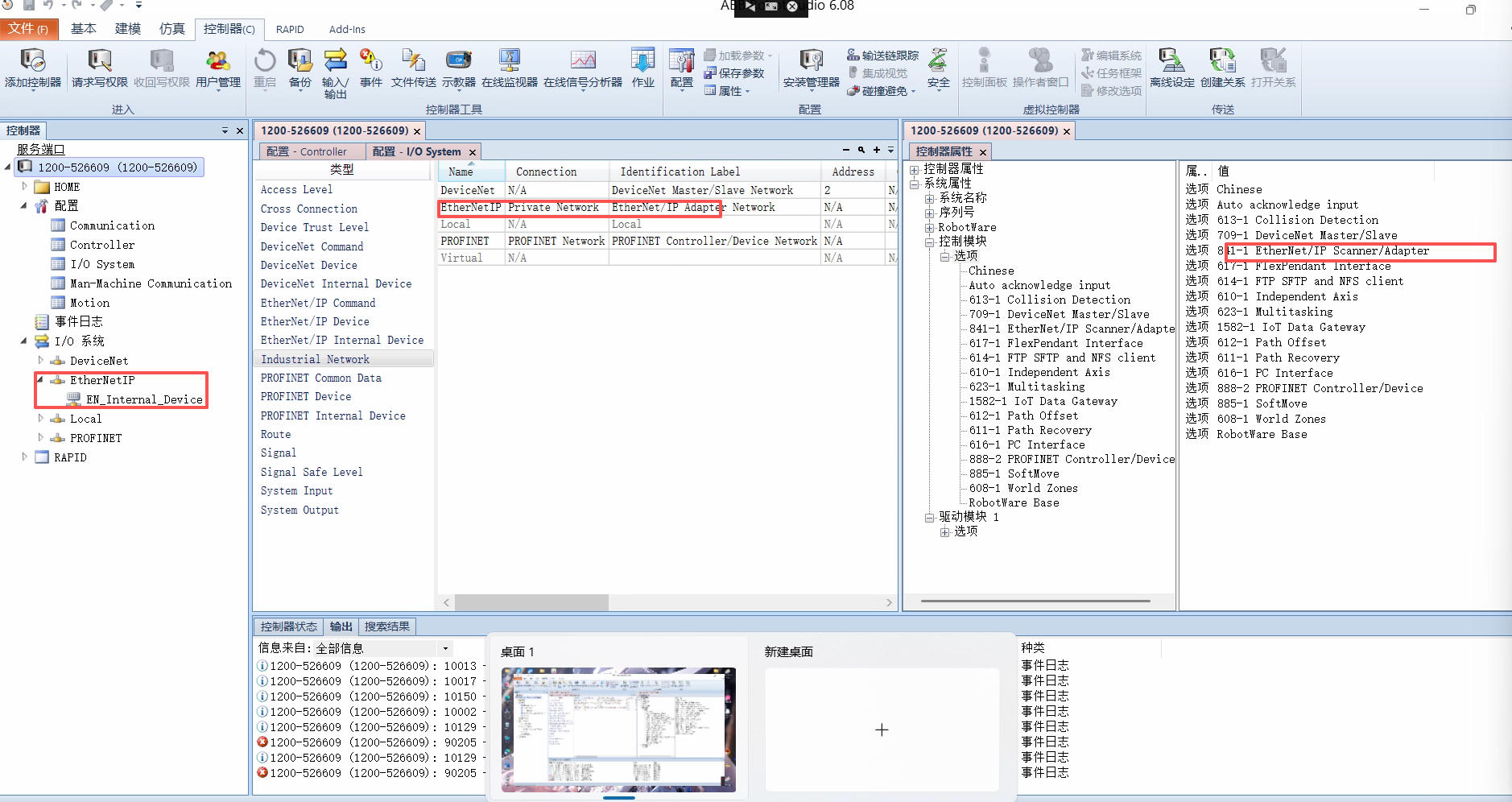 通信配置:DSQC1030 模块使用 EtherNet/IP 协议,第一次开机后,系统会自动识别硬件板卡。若开机时错过配置提示信息,也可进入示教器的控制面板 - 配置 - EtherNetIP Device,添加模板选择 ABB LOCAL I/O,地址设为 192.168.125.100,然后再添加 signal,所属设备选 Local IO,完成配置后就可实现示教器与 DSQC1030 数字量板卡的通信控制。
