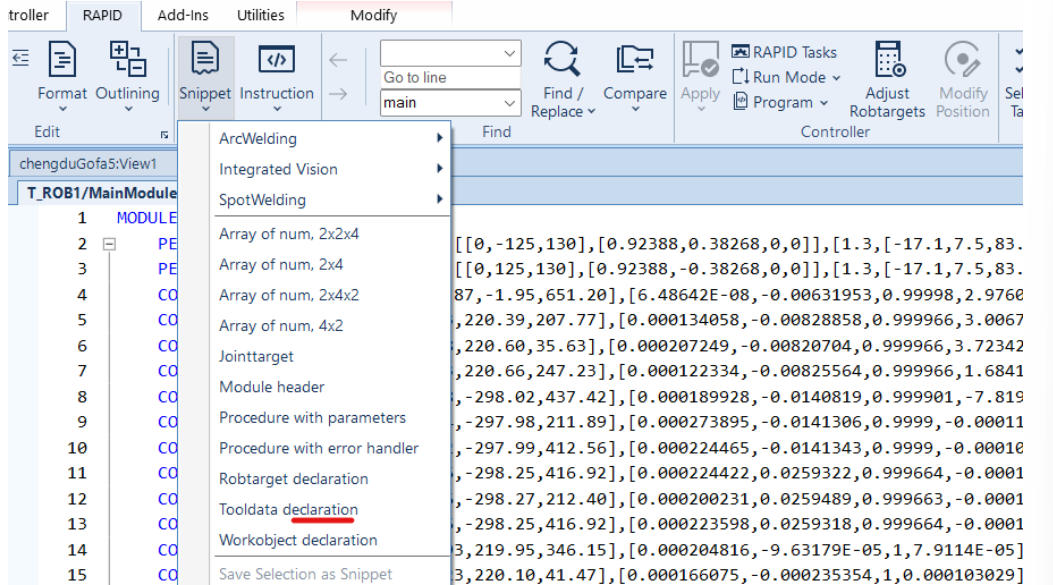 将生成的代码复制到 RobotStudio 的 RAPID 片段文件中,保存后即可批量插入。