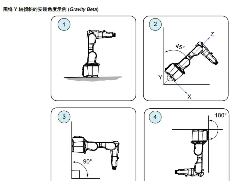 若机器人装设在倒置位置或墙壁上(绕Y轴旋转),就必须重新定义此机器人的基准 坐标系和系统参数Gravity Beta。之后Gravity Beta宜为π(+3.141593)(若将机器 人装设在倒置/悬空位置上)或±π/2(±1.570796)(若装设在墙壁上)。 Gravity Beta 是基坐标系中围绕 y 轴的正旋转方向。值以弧度设置。