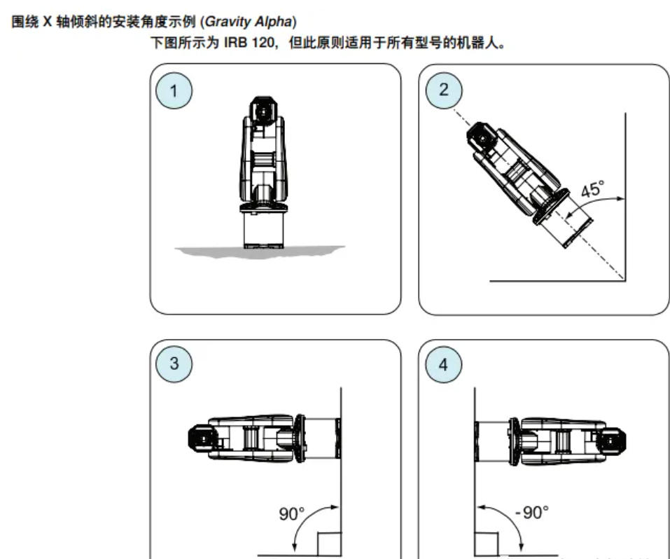 机器人在交付时被配置为平行于地面的安装,没有倾斜。如果机器人以0° 以外的任 何其他角度安装,那么描述安装角度(机器人相对于重力的方向)的系统参数必须被 重新定义。