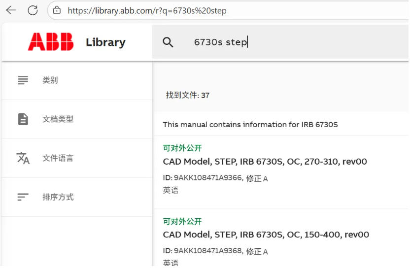 要获得对应的机器人STEP模型,可以在浏览器输入:https://library.abb.com/, 并在搜索框输入例如6730s step。即可得到对应机器人的step模型。(网站无需登录)