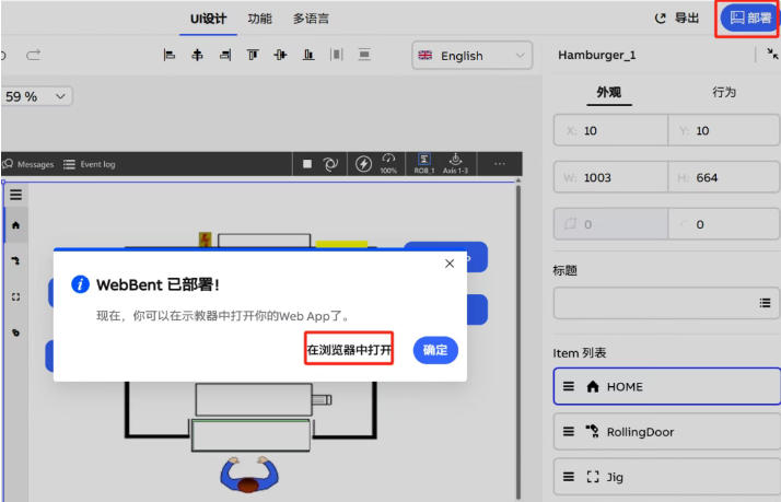 若使用AppStudio,可以连接到真实控制器或者虚拟控制器,并直接部署相关代码。在部署时,会弹出 在浏览器打开界面。若点击,可以直接打开浏览器查看。