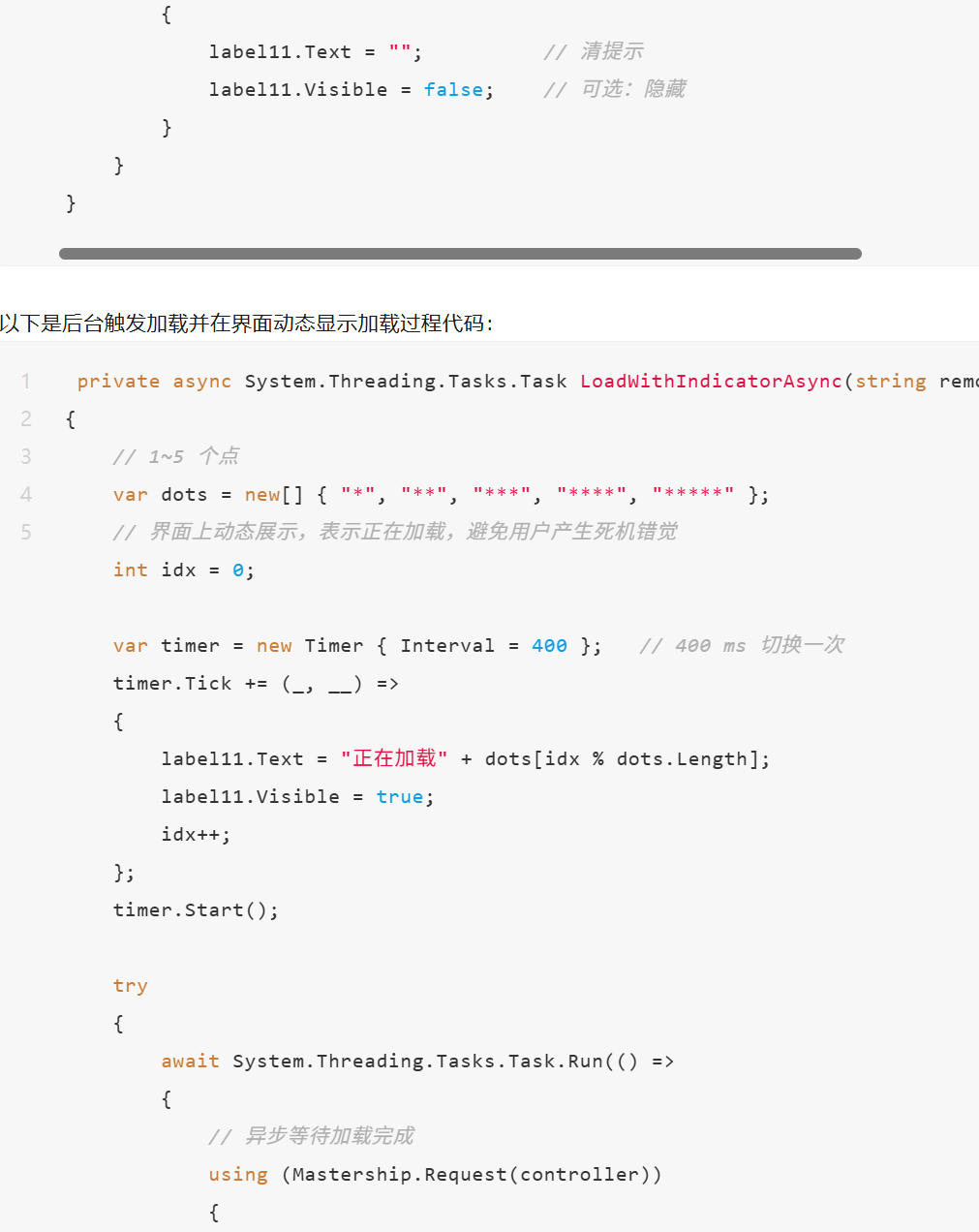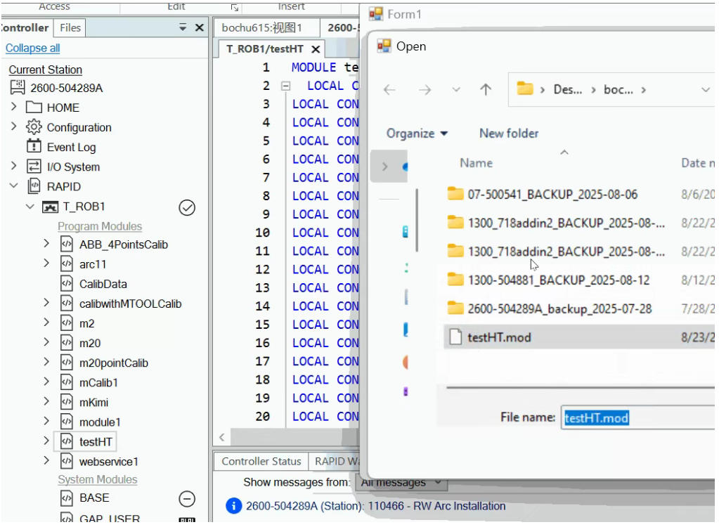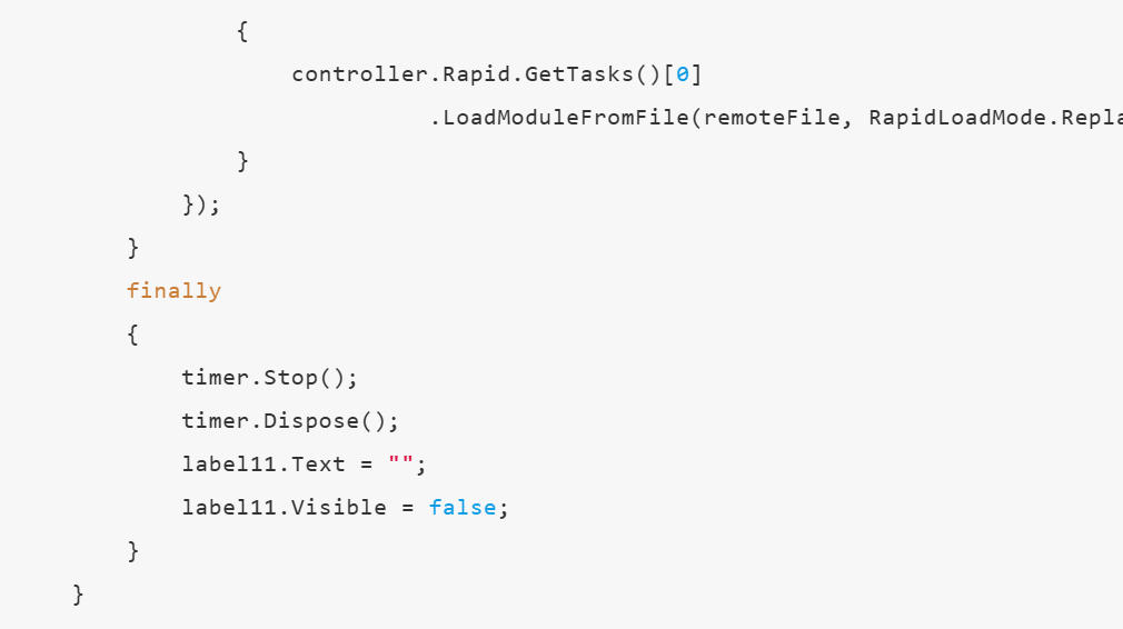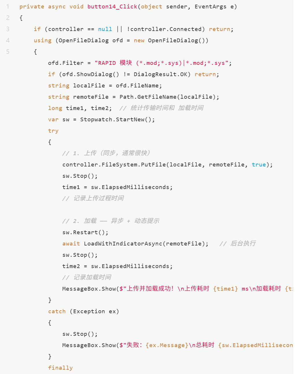 1. PCSDK 提供从本地传输文件到机器人HOME,并从HOME加载模块到控制器的函数。2. 对于大文件(例如一个mod里有3000个robtarget点和其他若干代码),执行LoadModuleFromFile耗时较长。若没有任何提示,容易让用户产生软件卡顿或者死机的错觉。(在RobotStudio中,如果有3000个点的代码修改应用,用户点击“应用”,也会出现卡顿现象)。3. 针对以上问题,可以参考以下代码,即把LoadModuleFromFile放在后台task,并对按钮的button_click事件采取异步处理。