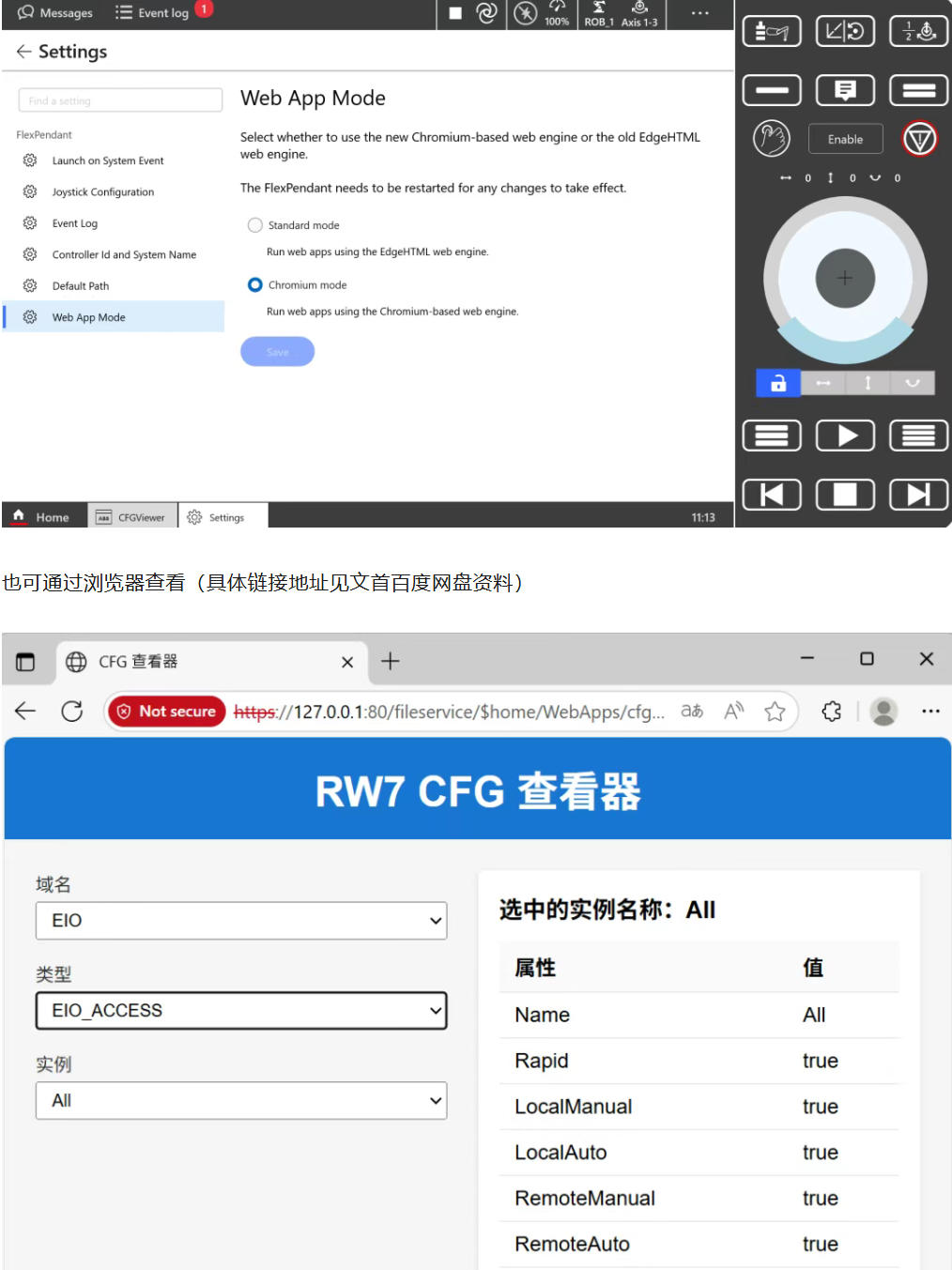 使用时,系统需要在rw7.18及以上,示教器内setting-flexpendant-Web App Mode设置为Chromium: