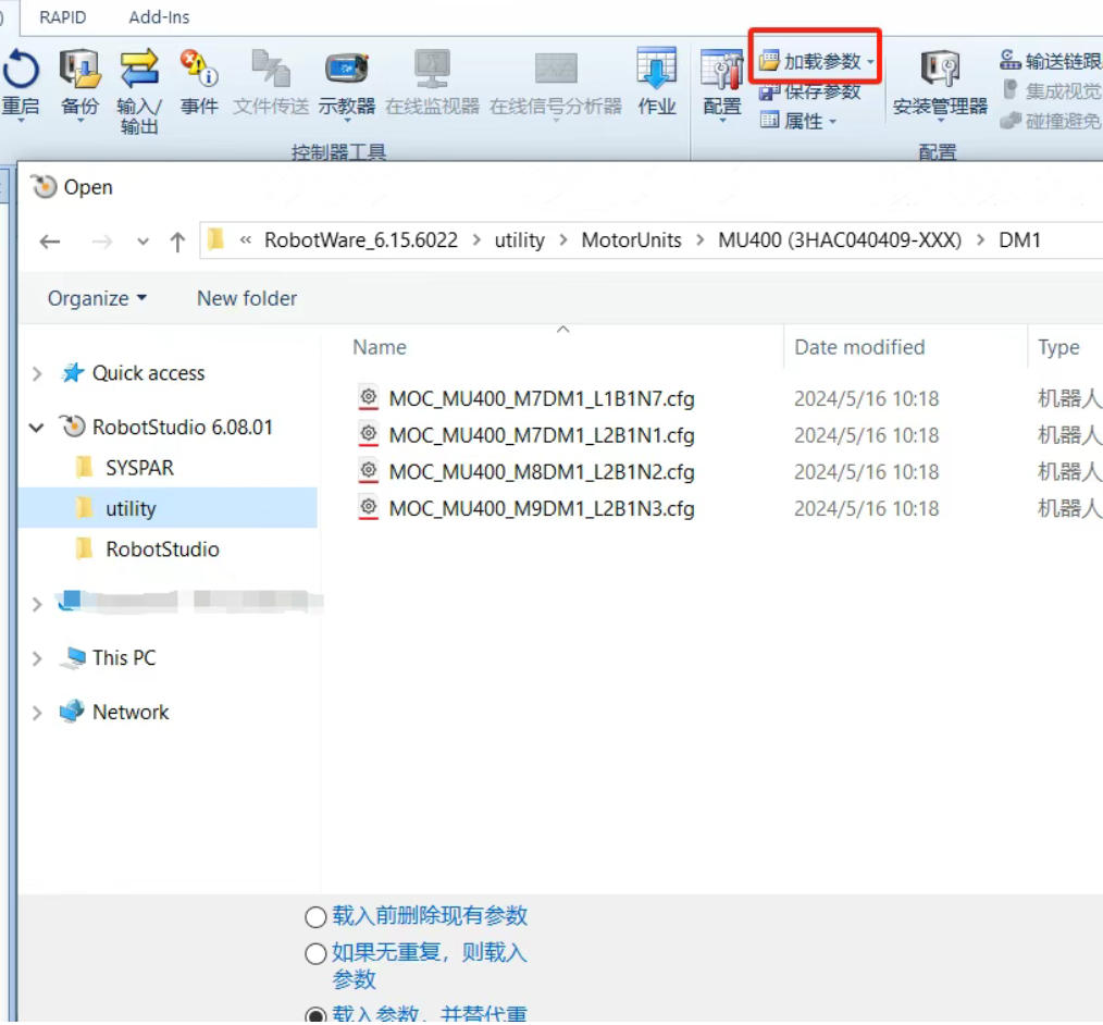 3.Robotstudio连接上真实控制器后,点击下图的“加载参数”,选择左侧的Robotstudio下的utility文件夹,进入以下路径:
