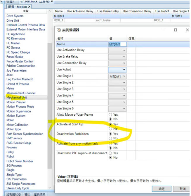 6.由于机器人安装在导轨上,通常导轨机械单元开机就激活,进入如下mechanicalunit界面,设置Activate at Startup为yes,将DeactivationForbidden设为yes