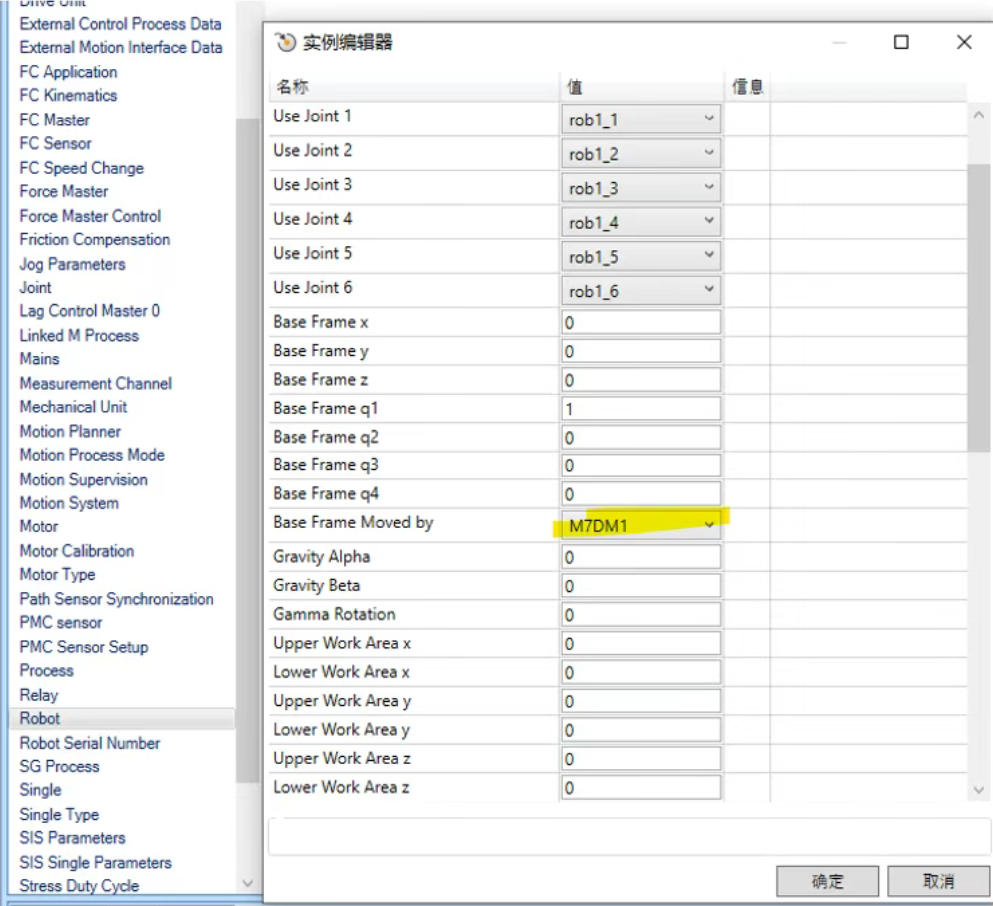 7.由于机器人安装在导轨上,进入robot界面,baseframe Moved by 选择M7DM1