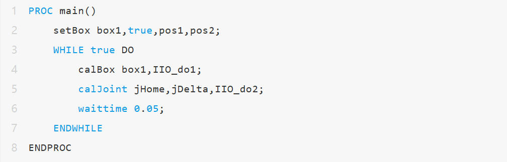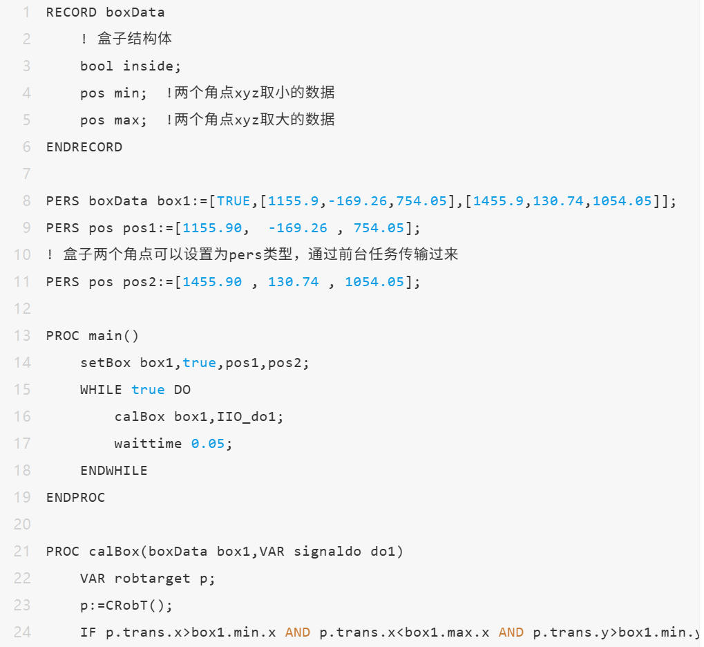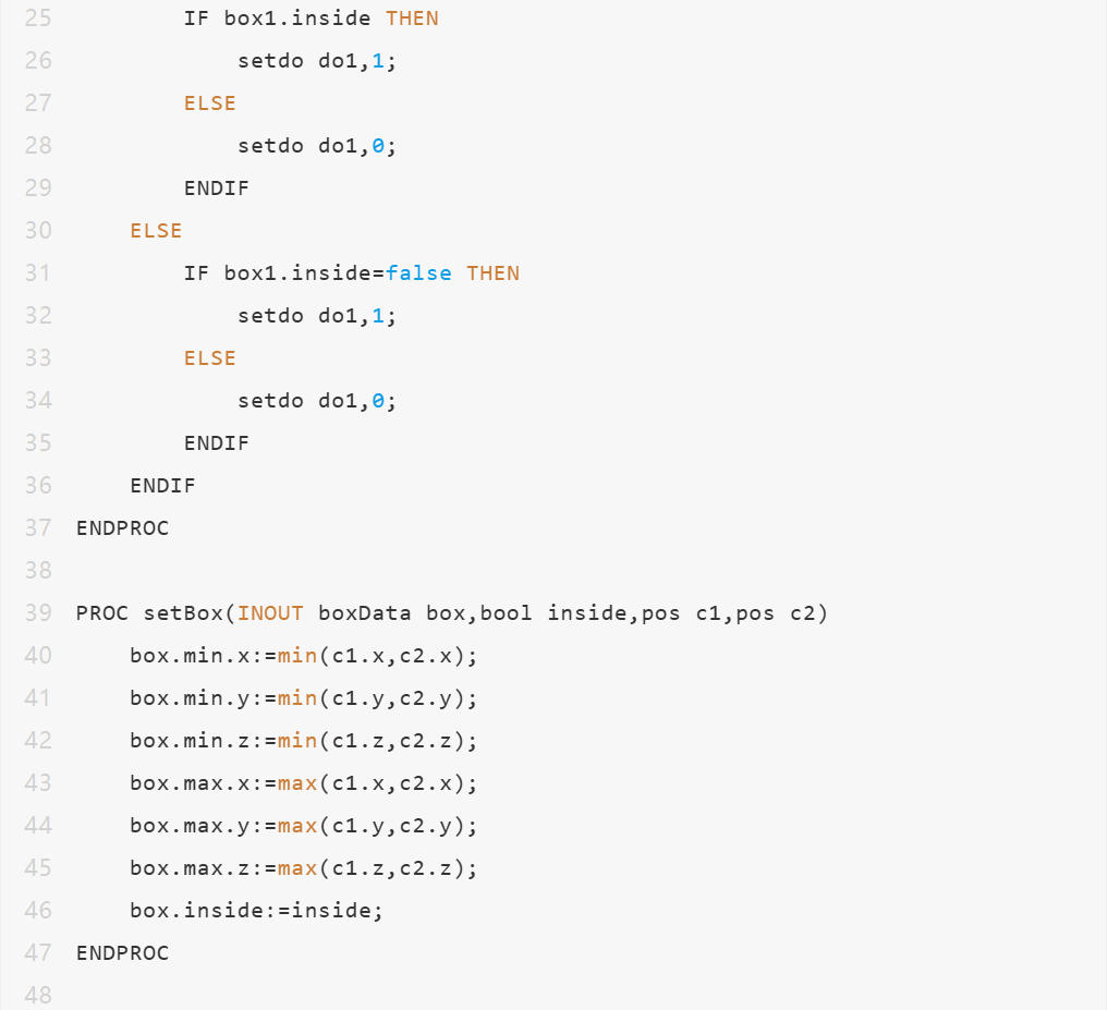 若现场暂无WorldZone选项,又需要临时实现WorldZone功能,则可以参考以下实现(机器人需要有多任务multi-task选项,监测代码运行在后台)1. 对于机器人空间设置,例如上图的立方体,通常可以人物采集两个对角线的角点数据。并计算两个角点中的xyz取小数据作为min,取大数据作为max。2. 判断机器人当前TCP位置在min和max之间